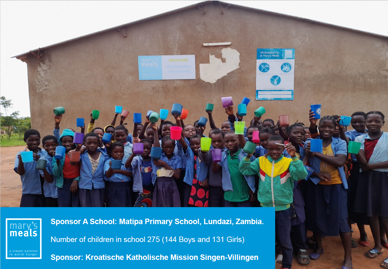 uskoro se navršava godinu dana od naše obnove kumstva s osnovnom školom Matipa Primary School u Zambiji. Kao misijska zajednica rado bismo htjeli obnoviti kumstvo s ovom školom u kojoj se Vašom darežljivošću omogućuje dnevni obrok za 275 učenica i učenika čime im se pomaže u procesu obrazovanja. Svoj prilog možete dati u sakristiji u svim mjestima poslije sv. mise počevši od subote 18. listopada. Priloge ćemo prikupljati dok ne skupimo potrebni iznos. Visina godišnje naknade za školske obroke za jedno dijete iznosi 22 eura.